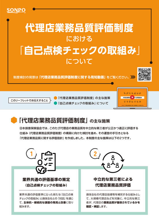 損保協会では、損害保険会社による代理店に対する指導等を補完するための業界共通の枠組みとして、代理店業務品質評価制度を運営しています。本制度は、損害保険会社や代理店と利害関係のない中立的な第三者で委員構成する「代理店業務品質評議会」が運営しています。