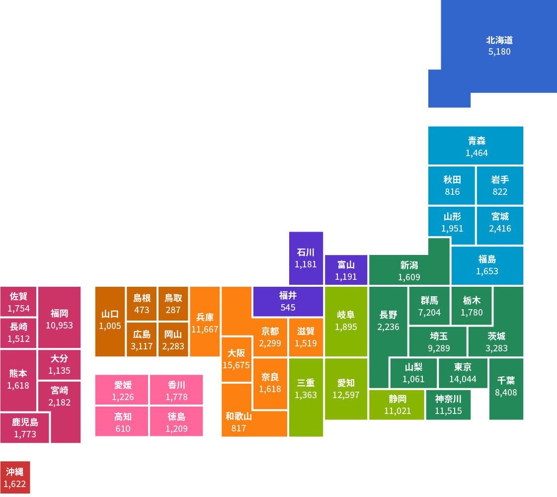 日本地図の都道府県をクリック(タップ)するか、プルダウンメニューで選択すると、各都道府県の情報を閲覧できます。
